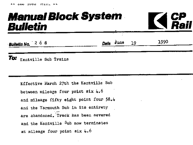The sale of assets to 510845 N.B. Inc. did not include the trackage from Victoria Junction to Glace Bay, Nova Scotia. This trackage has been functionally abandoned since the early 1990s when the sole customer ceased shipping coal by rail. Most of the road crossings and trestles have been removed at the request of local Municipalities.